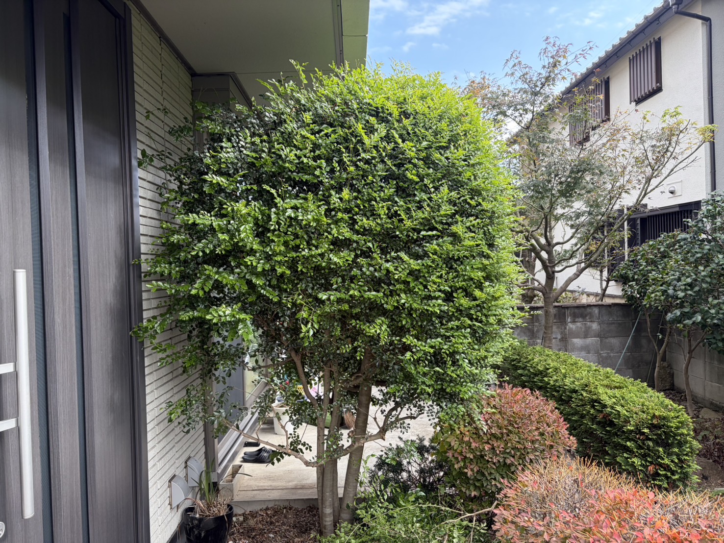 こんにちは。多摩市を中心に庭木、観葉植物を取り扱う MY GREEN です。先日、ご近所さんにご依頼いただきお庭のメンテナンスに入らせていただきました。だいぶ大きくなってしまったマキの木もすっきり。高